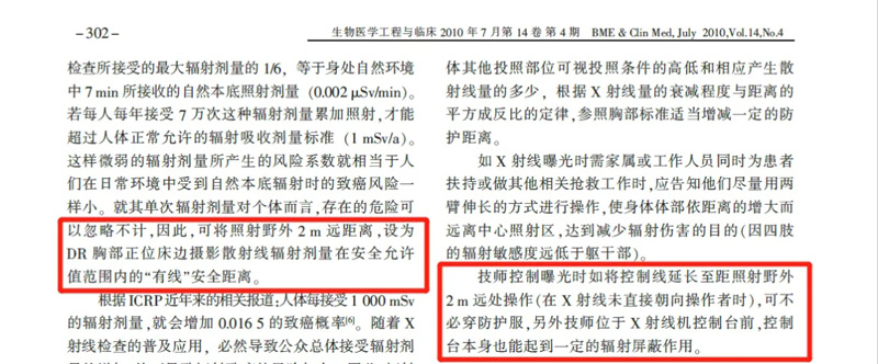 移動DR是可以在病房進行檢查的X射線檢查機器。移動到各個科室對病患進行檢查。但是它又不像放射科有輻射屏蔽條件。那么移動DR在檢查過程中,同個病房的病人跟檢查的醫(yī)護人員需要怎么樣的防護呢?一般危重病人,手術室中搶救的病人,不能移動的病人才能使用移動DR。移動DR的電流在400-650mA,而其他普通DR的電流在600-800mA之間。在胸片拍攝的工作電流一般大概在250mA。有使用不定時不固定位置的特點。胸部放射線輻射劑量均低于自然本底照射值?!稊?shù)字X射線攝影機床邊胸部攝影時周圍散射線量測量》距照射野外2米有限安全距離,其散射線劑量低于人體7分鐘所接受的自然本底照射劑量。自然本底環(huán)境照射野外2.5米無線安全距離。
