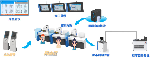 采血流程:患者到窗口采血-掃碼或讀就診卡-核對(duì)檢驗(yàn)項(xiàng)目-打印標(biāo)簽-選擇試管-粘貼試管-護(hù)士采血。人工采血存在問題人工選管、打印、粘貼,勞動(dòng)強(qiáng)度大。容易出現(xiàn)人為錯(cuò)誤。貼歪、貼倒(不能識(shí)別)。位置錯(cuò)誤(流水線無法識(shí)別)。視窗覆蓋(無法觀察血液情況)。可能出現(xiàn)漏采或多采血。智能采血設(shè)備解決采血人的排隊(duì)難題,智能采血管理系統(tǒng)把采血管的準(zhǔn)備工作自動(dòng)化,縮短等待時(shí)間。采血流程需要全面的優(yōu)化,報(bào)到取號(hào),65歲以上老人優(yōu)先。智能叫號(hào)不需要長時(shí)間的排隊(duì)。采血管容量大,處理速度快,能有效加快采血速度,提高采血服務(wù)質(zhì)量。自動(dòng)化代替了傳統(tǒng)人工的操作模式。自動(dòng)識(shí)別自動(dòng)貼標(biāo),自動(dòng)標(biāo)本核收。大大的減少人工誤差。也減少繁雜的采血前準(zhǔn)備,系統(tǒng)具有諸多優(yōu)勢,將為客戶帶來全新的體檢體驗(yàn)。