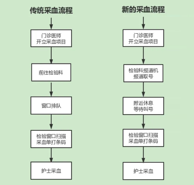 門診醫(yī)師開采血項目>報道機報道取號>座位休息等待叫號機叫號>檢驗窗口掃描采血單條碼>護士采血