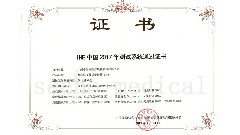 廣州市顯浩醫(yī)療設(shè)備股份有限公司一直專(zhuān)注于醫(yī)療車(chē)設(shè)備及其配套產(chǎn)品的研發(fā)和生產(chǎn),其中公司生產(chǎn)的數(shù)字化X線(xiàn)采集軟件在2017年4月14日就成功通過(guò)中國(guó)醫(yī)學(xué)裝備協(xié)會(huì)醫(yī)學(xué)裝備信息交互與集成分會(huì)關(guān)于DR設(shè)備系統(tǒng)的測(cè)試,并榮獲 IHE中國(guó)2017年測(cè)試系統(tǒng)通過(guò)證書(shū)。